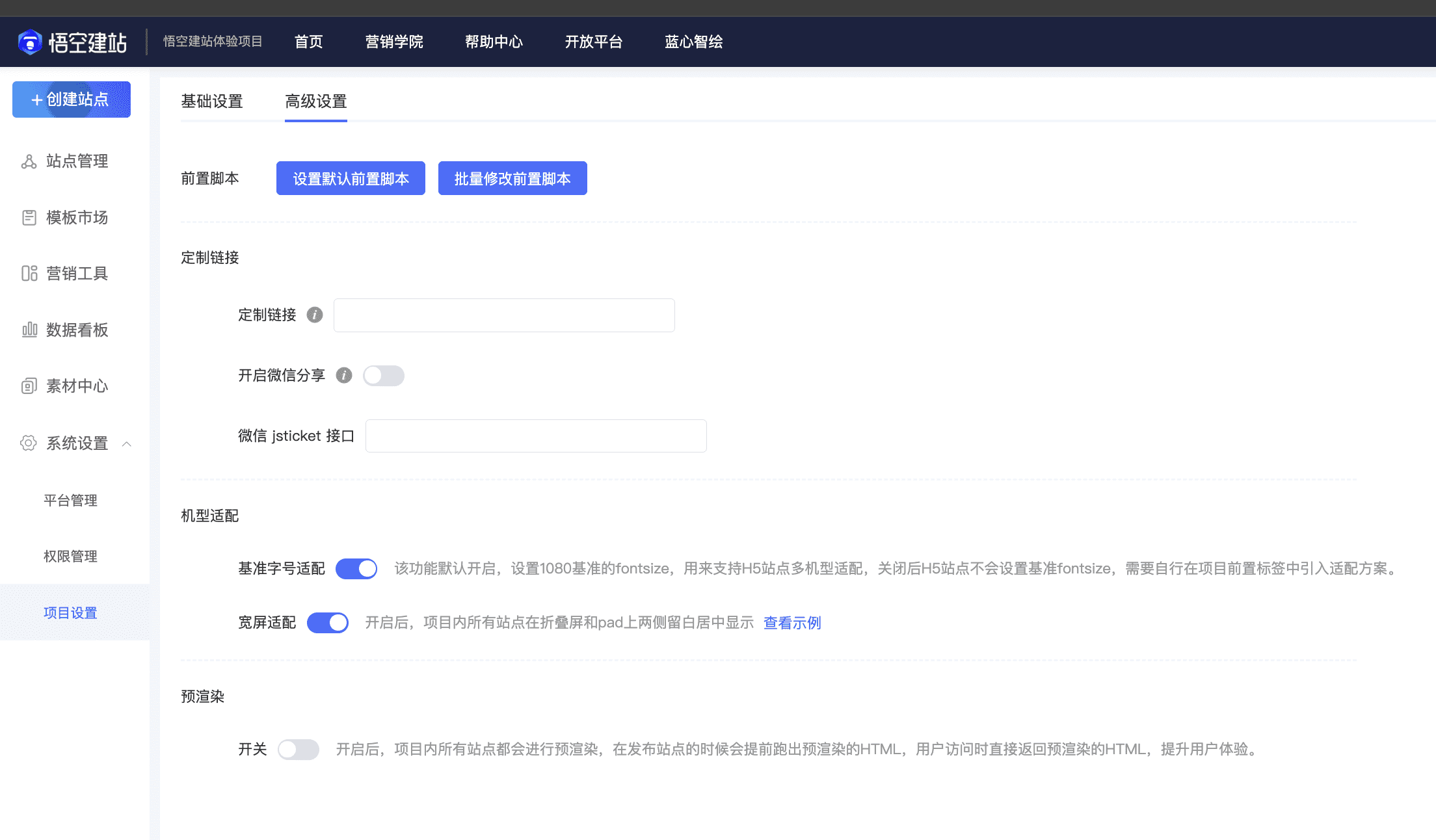 如何通过开启页面预渲染开关,提升页面加载速度功能说明为了大幅度减少H5页面的白屏时间,悟空系统支持页面预渲染功能。预渲染是一种将动态生成的网页内容预先转换为静态HTML文件的技术。当用户请求页面时,服务器直接返回预先生成的静态文件,而不是每次请求都执行数据库查询和动态渲染。适用场景1、内容相对固定的页面2、高并发访问的页面3、对性能要求较高的场景开启方式在项目设置中开启页面预渲染,操作路径:...